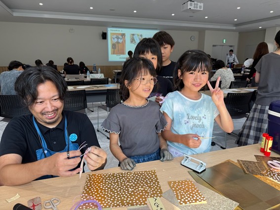 藍染め体験の合間には、小学校で使用後、廃棄予定だった朝顔プラスチック鉢を筆の「持ち手」部分にリサイクルした熊野筆(広島県 伝統的工芸品)と、墨汁の代わりに藍染液を使い、ワークショップを開催。 日用品使用済プラスチック空容器からできた「うちわ」に、子どもたちはそれぞれ思い思いに絵を描き、完成した作品を見せ合いながら大盛り上がり! 「自分で絵を描けて楽しかった」「他の子のユニークな絵を見るのも面白かった」といった感想もたくさんありました。 さらに、使わなくなった金銀箔紙(きんぎんぱくし)を活用した本のしおり作りも大人気。箔はとても繊細で傷がつきやすく、製造の過程で端材が出やすい素材。今回はその端材を好きなサイズに切り取り穴を開け、水引で結び、しおり裏面に藍染液で名前や絵等を書き、世界にひとつだけのしおりが完成。「家でもやってみたい」と、金銀箔紙を持ち帰る子どもたちの姿も見られました。